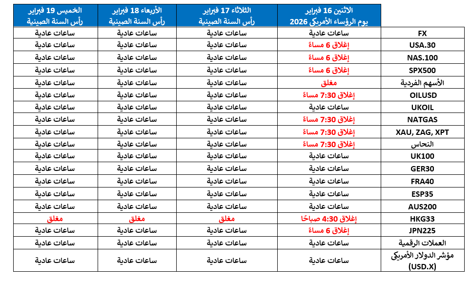 | XAU, XAG, XPT | ساعات عادية | ساعات عادية | ساعات عادية | إغلاق الساعة 14:30 وإعادة الفتح الساعة 18:00 |